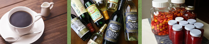 コーヒーはご自由にお飲みください。 その他別注文にて、ビール、地酒、信濃ワイン、ソバ焼酎、 あずみ野りんごジュース、山の木の実の飲物(すもも、ごみし、山桜の実等)などをご用意しております。