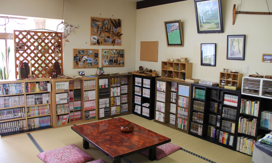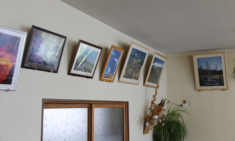 お客様からいただいた作品などが飾られた、安らぎの館内です。